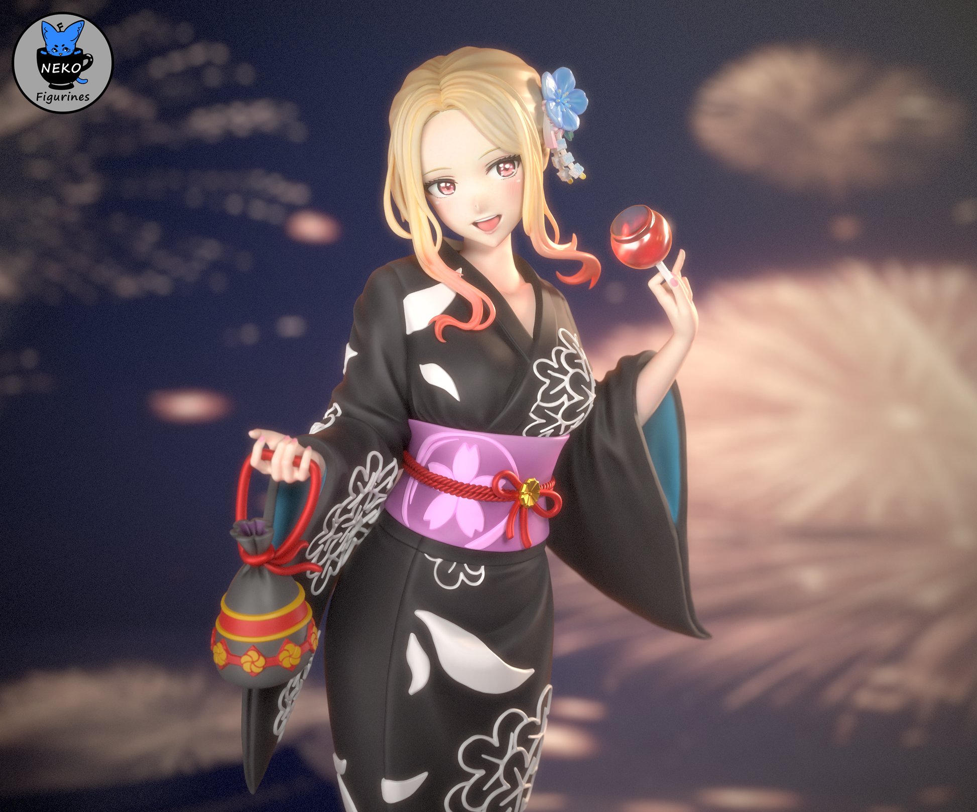 Figura de resina inspirada en Marin Kitagawa con yukata, tal como aparece en el episodio 12 del anime My Dress-Up Darling. Esta encantadora figura captura a Marin con un elegante yukata, lista para disfrutar de un festival de fuegos artificiales con su bolso tradicional y una manzana caramelizada.